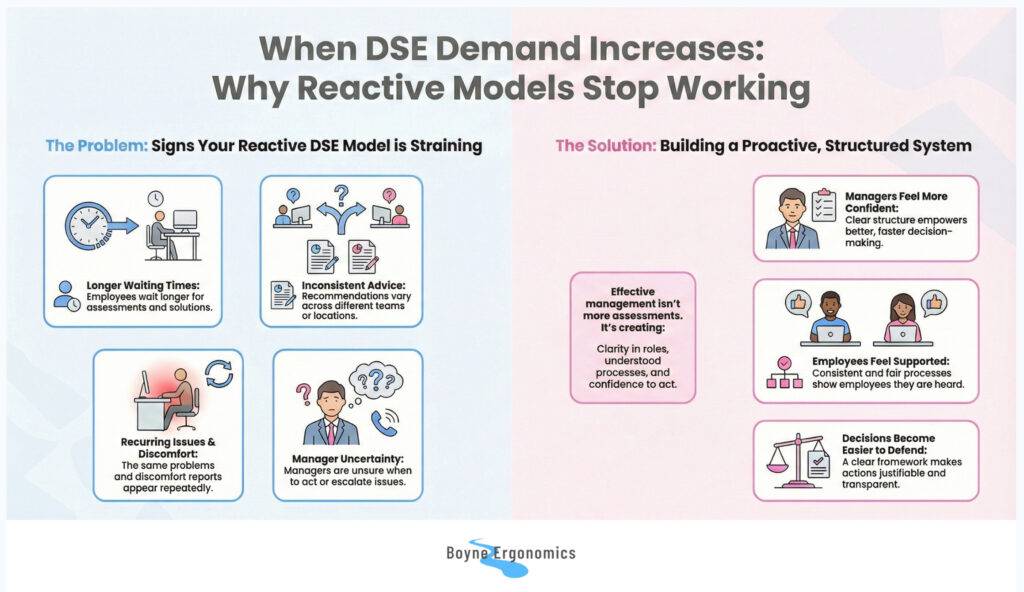 organisations with proactive DSE programmes tend to experience a lower demand for in-depth ergonomic risk assessments and specialist interventions over time, compared to those relying primarily on reactive responses.